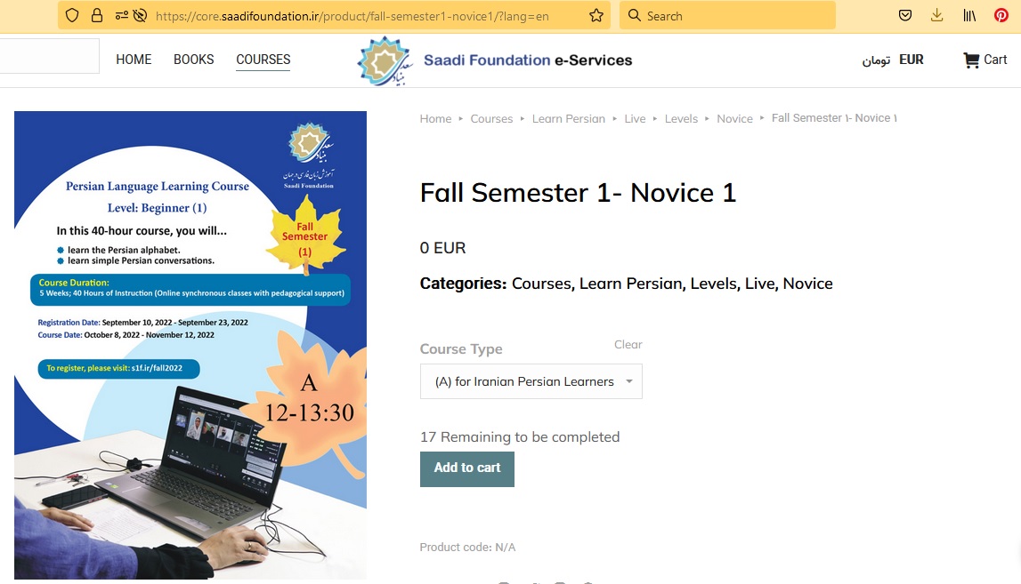 بنابر اعلام معاونت آموزش و پژوهش بنیاد سعدی، روش برگزاری دوره ویژه کودکان ایرانیان مقیم خارج از کشور (نوآموز ۱) به صورت «برخطِ همزمان» و به مدت ۴۰ ساعت است و کلاسها در قالب ۱۶ جلسه از ۱۶ مهر تا ۲۱ آبان ۱۴۰۱ برگزار میشود.