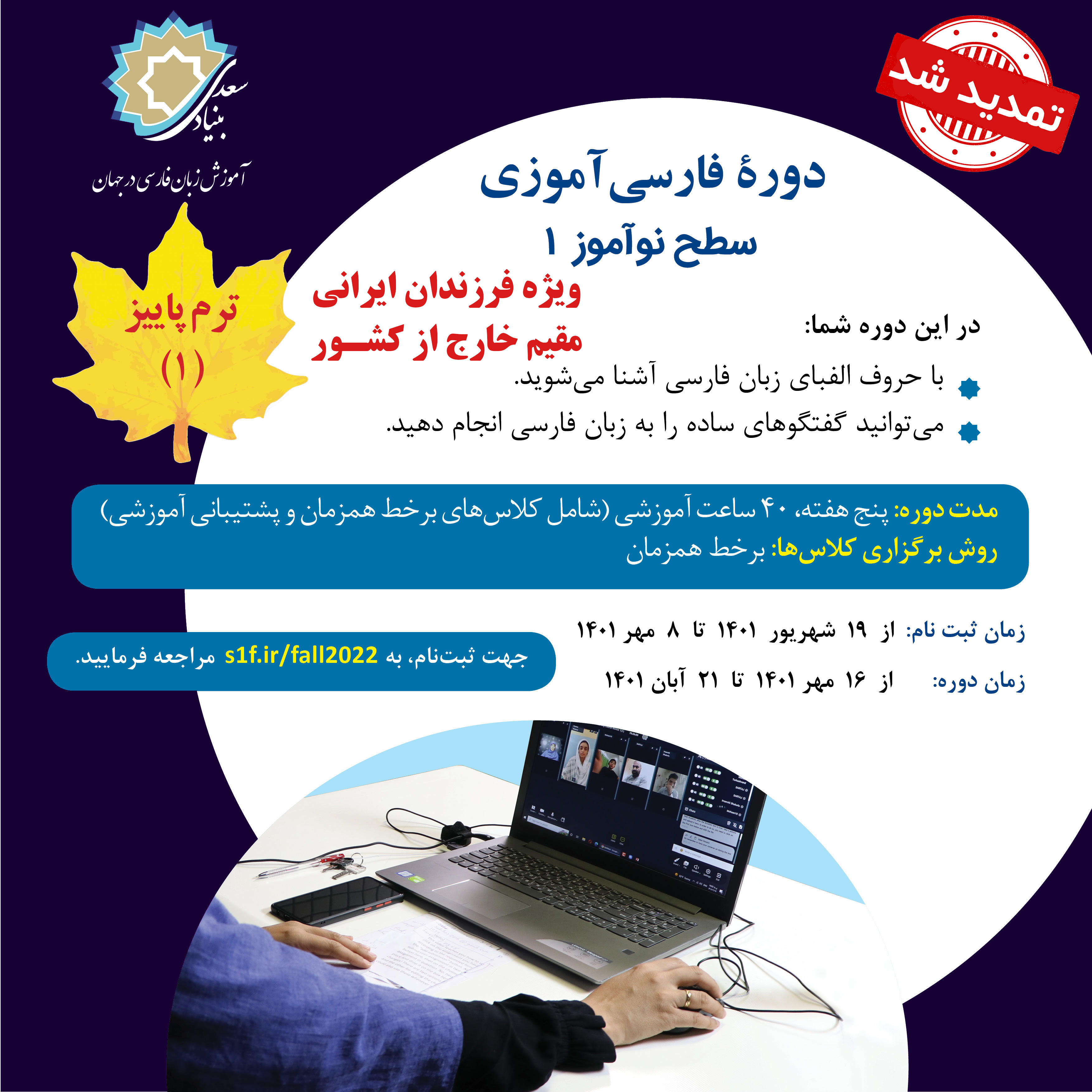 بنیاد سعدی دوره برخط همزمان فارسیآموزی ویژه کودکانِ ایرانیان مقیم خارج از کشور را در پاییز ۱۴۰۱ برگزار میکند که ثبت نام آن از ۱۹ شهریور آغاز و تا هشتم مهرماه ۱۴۰۱ تمدید شد.