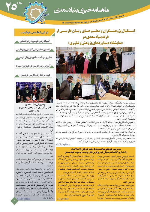 بیست و پنجمین «ماهنامه خبری آموزش زبان فارسی به غیر فارسی زبانان» با عناوین «اخبار بنیاد سعدی»، «آموزش زبان فارسی در جهان» و «بنیاد سعدی در رسانهها» مربوط به آذر ماه ۱۴۰۱ منتشر شد.