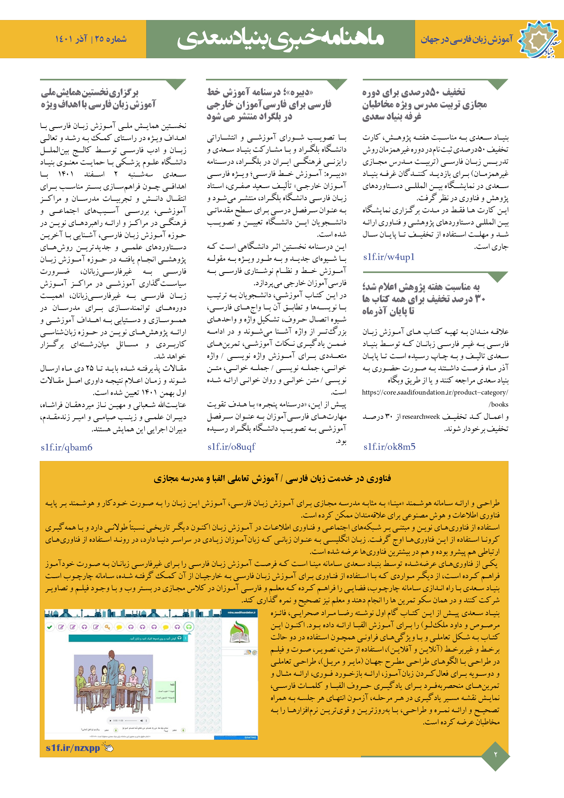 در بخش آموزش زبان فارسی در جهان نیز عناوین متنوعی آمده است که عبارتند از: نخستین دوره المپیاد ایران شناسی و زبان فارسی در قزاقستان برگزار شد، نخستین دوره آموزش ایران شناسی و زبان فارسی در دانشگاه دفاع ملی قزاقستان برگزار شد، همزمان با روز دانشجو از برگزیدگان المپیاد ایرانشناسی و زبان فارسی در دانشگاه ملی اوراسیا تجلیل شد، برگزاری نخستین همایش ملی آموزش زبان فارسی با اهداف ویژه، نخستین نشست اعضای مؤسس انجمن دوستداران زبان و ادب فارسی در یونان تشکیل شد، نماینده بنیاد سعدی در آنکارا از مرکز آموزش زبان فارسی بازدید کرد، دوره مقدماتی زبان فارسی به صورت برخط در دانشکده دکن هند در حال برگزاری است، برگزاری دورههای آموزش زبان فارسی در مناطق و جمهوریهای مختلف فدراسیون روسیه، برگزاری امتحانات پایان دوره پاییزی آموزش زبان فارسی در عشقآباد، پخش برنامه آموزش زبان فارسی در تلویزیون سوریه دوره پیش میانی زبان و ادبیات فارسی به صورت برخط در بمبئی در حال برگزاری است.