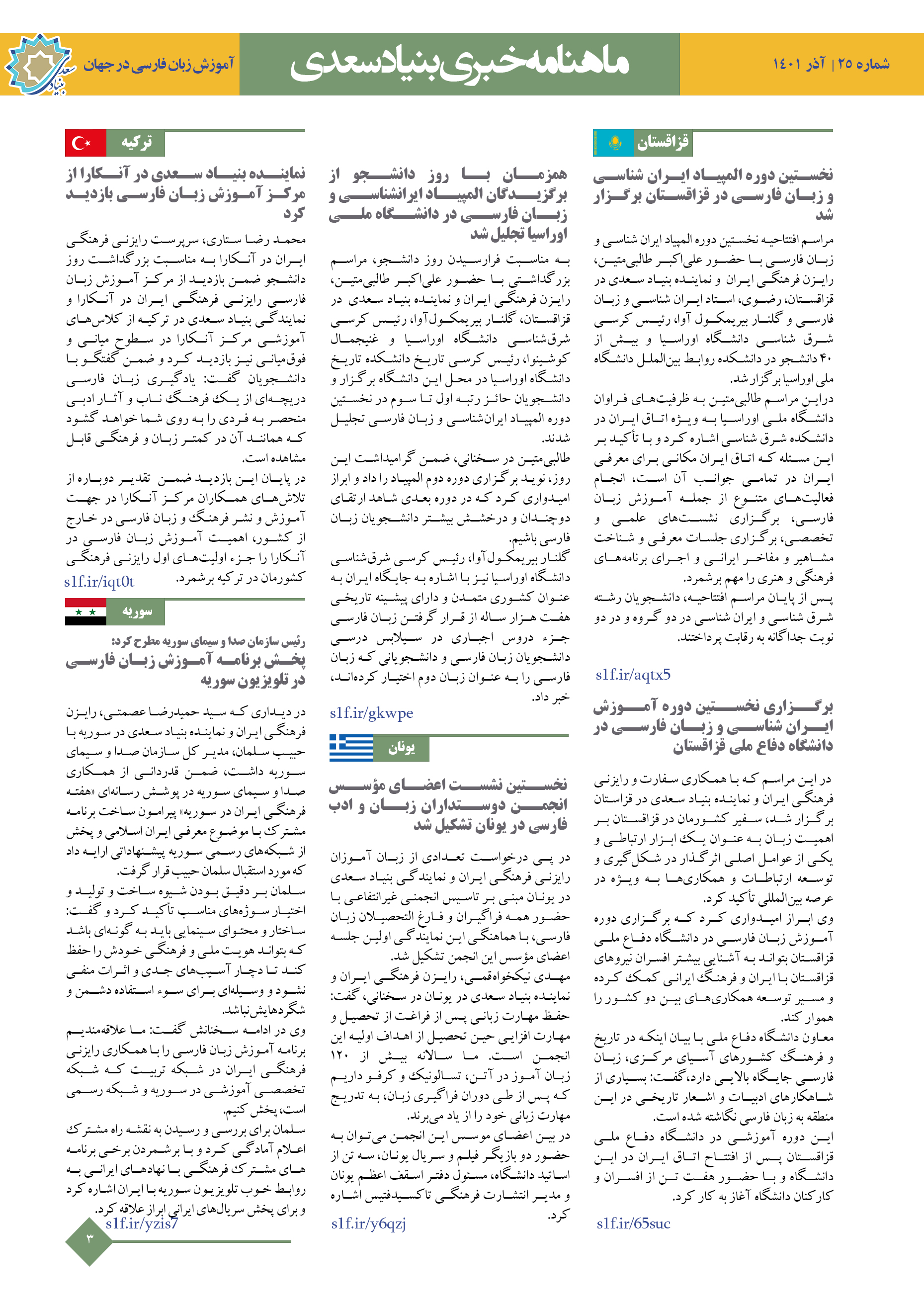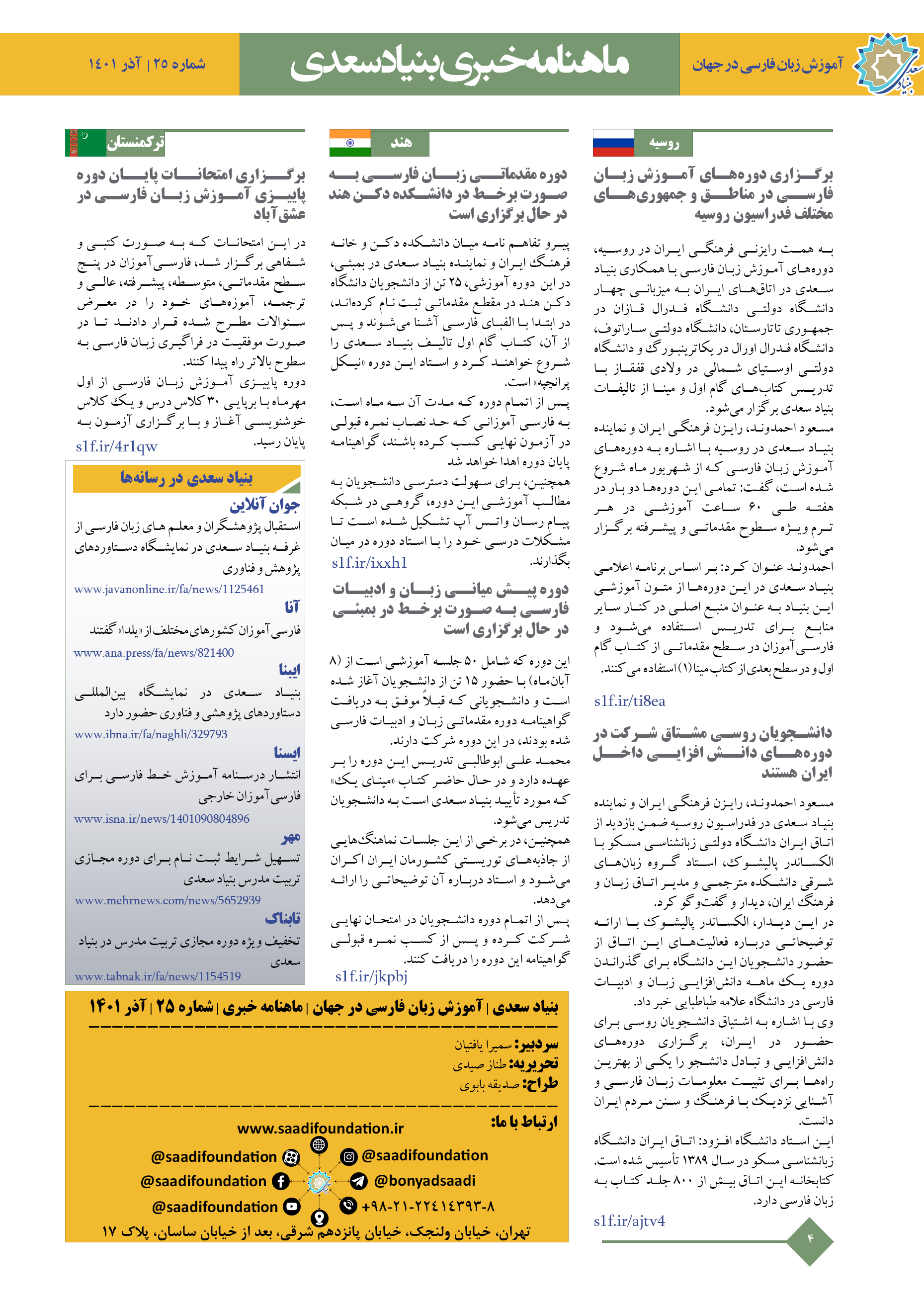 به گزارش روابط عمومی بنیاد سعدی، علاقهمندان به رویدادهای زبان فارسی در جهان میتوانند با کلیک روی لینک کوتاه، خبر اصلی را به صورت کامل روی وبگاه مشاهده کنند و همچنین نسخه الکترونیک آن را که به صورت گسترده بازنشر میشود، بخوانند. در بیست و پنجمین شماره ماهنامه بنیاد سعدی شاهد اخباری به شرح زیر هستید: