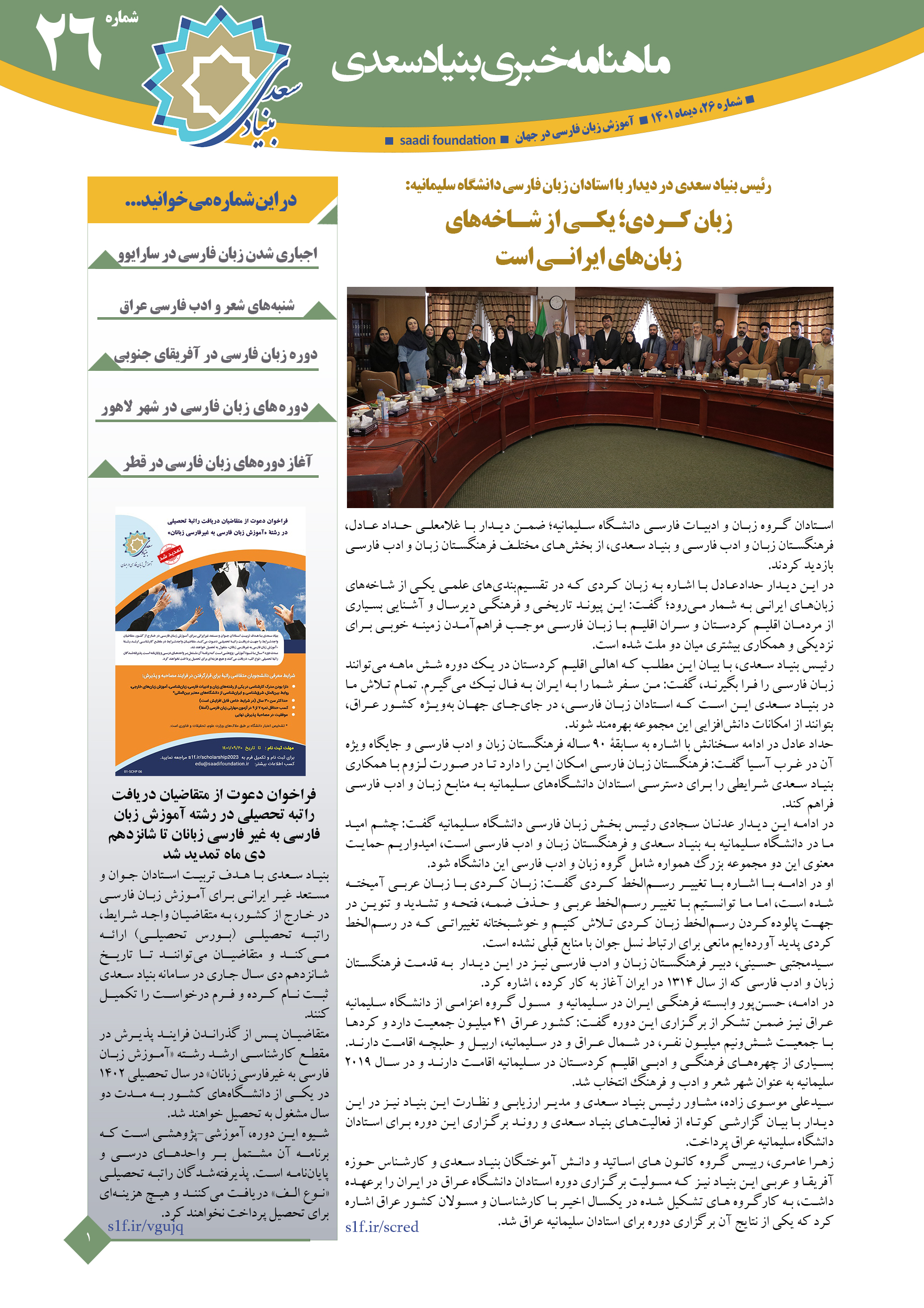 بیست و ششمین ماهنامه «ماهنامه خبری آموزش زبان فارسی به غیر فارسی زبانان» با عناوین «اخبار بنیاد سعدی»، «آموزش زبان فارسی در جهان» و «بنیاد سعدی در رسانهها» مربوط به دی ماه ۱۴۰۱ منتشر شد.