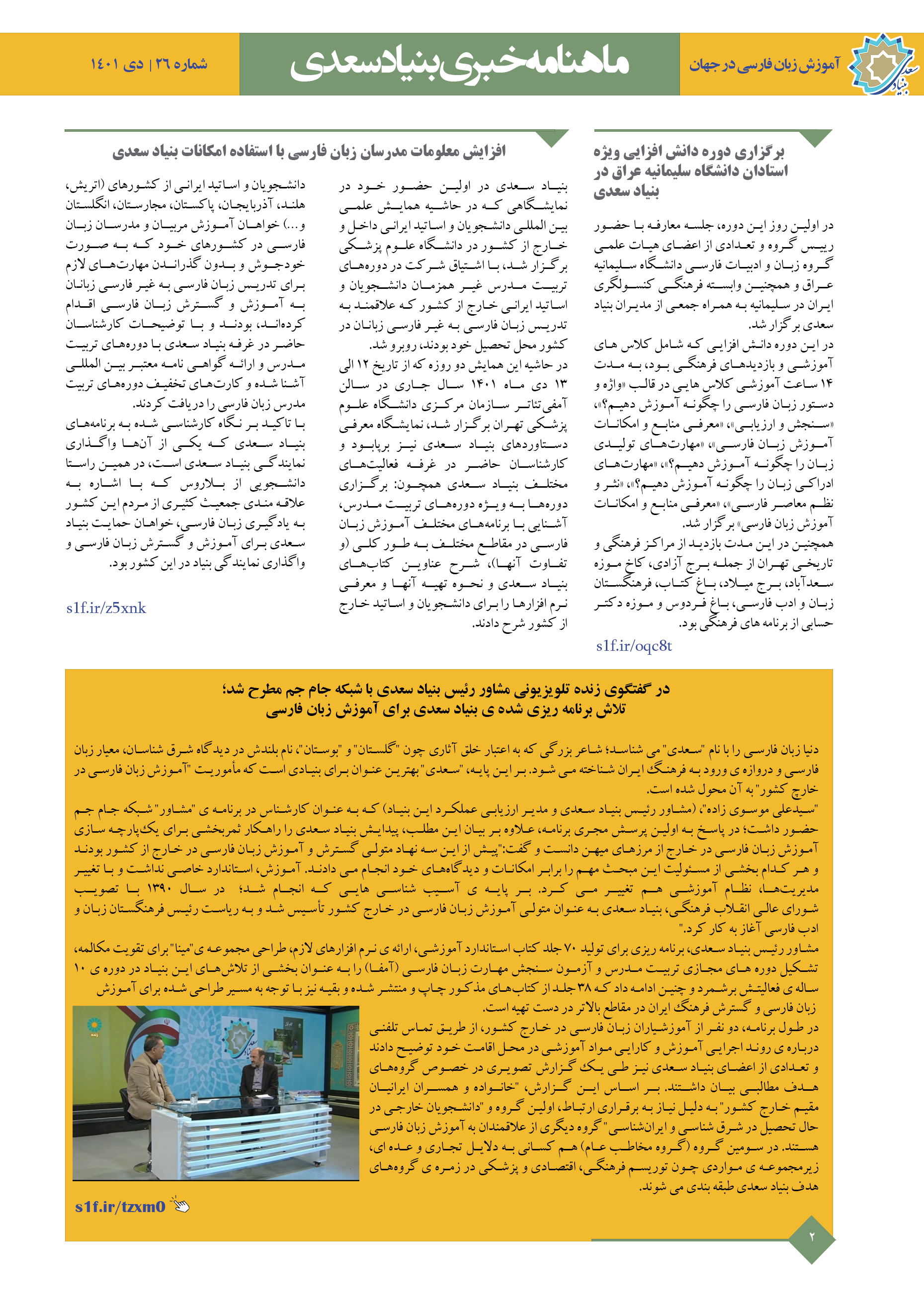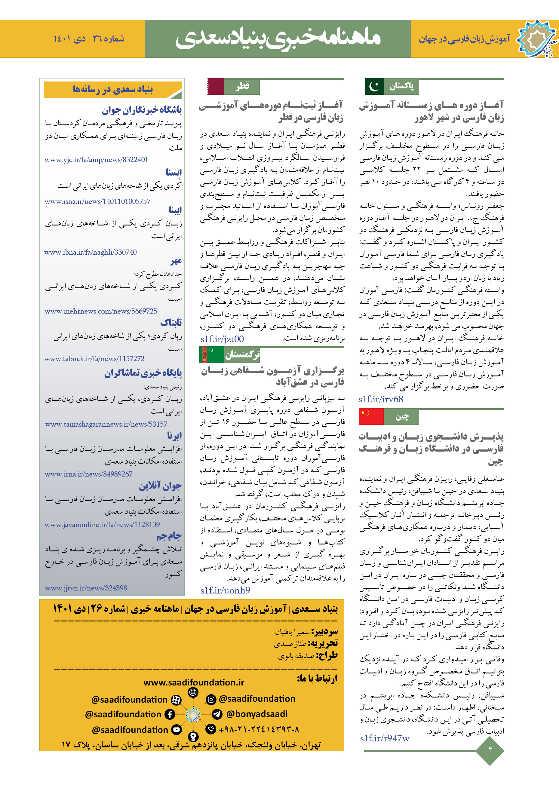 به گزارش روابط عمومی بنیاد سعدی، علاقهمندان به رویدادهای زبان فارسی در جهان میتوانند با کلیک روی لینک کوتاه، خبر اصلی را به صورت کامل روی وبگاه مشاهده کنند و همچنین نسخه الکترونیک آن را که به صورت گسترده بازنشر میشود، بخوانند. در بیست و ششمین شماره ماهنامه بنیاد سعدی شاهد اخباری به شرح زیر هستید: