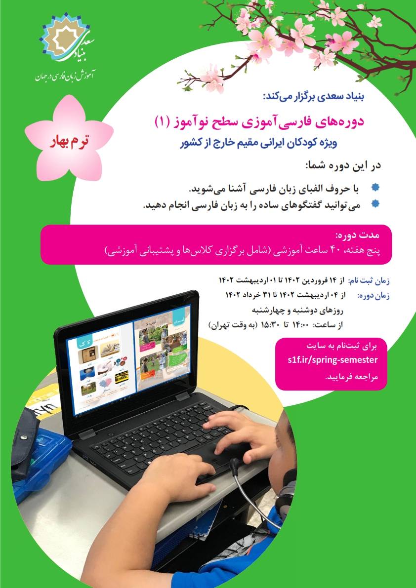 ثبتنام دوره بهاره برخط فارسیآموزی سطح نوآموز ۱ ویژه کودکان ایرانی مقیم خارج از کشور از امروز ۱۴/۰۱/۱۴۰۲ (۰۳/۰۴/۲۰۲۳) آغاز و تا ۰۱/۰۲/۱۴۰۲ (۲۱/۰۴/۲۰۲۳) ادامه دارد.