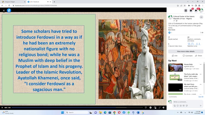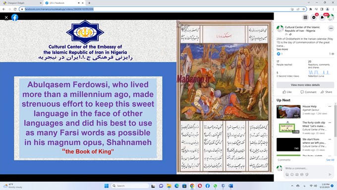 به منظور معرفی فردوسی شاعر نامدار ایران اسلامی به جهانیان و آشنایی با آثار و اندیشه های این شاعر بزرگ اقلیم بزرگ ایران فرهنگی و به مناسبت بیست و پنجم اردیبهشت ماه، روز پاسداشت زبان فارسی نماهنگی تحت عنوان"فردوسی احیاگر زبان فارسی" به زبان انگلیسی تدوین شده و در صفحات اجتماعی و پرتال نمایندگی فرهنگی ایران در نیجریه منتشر شده است.