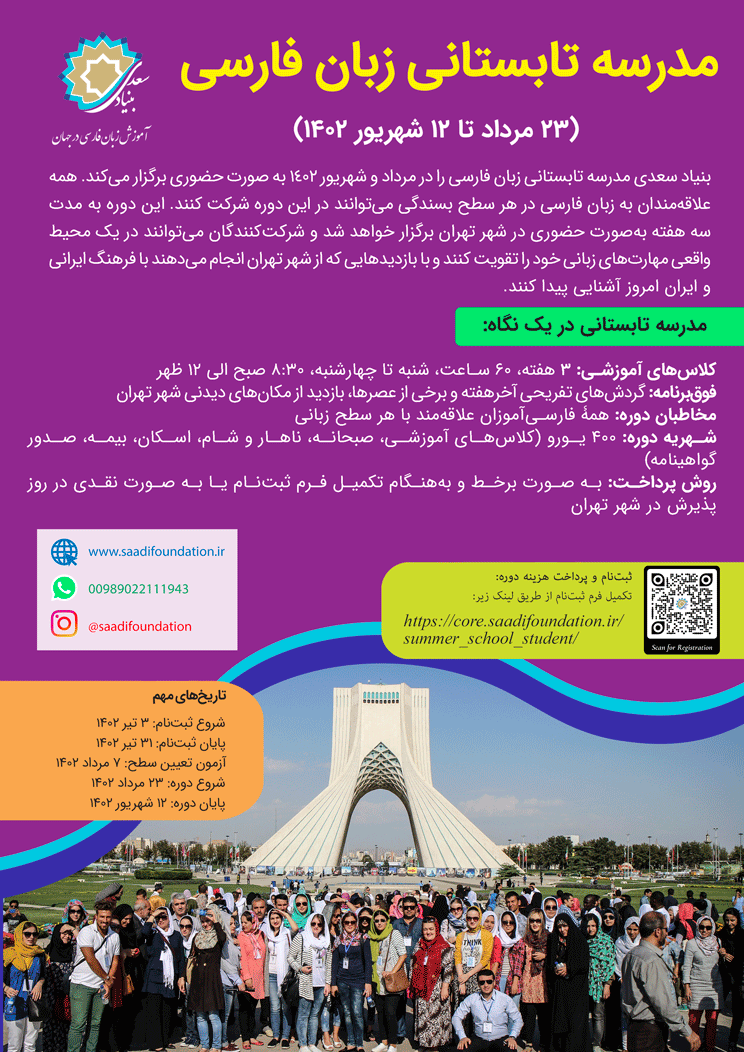 به گزارش روابط عمومی بنیاد سعدی، دورههای آموزش زبان فارسی در مدرسه تابستانی زبان فارسی بنیاد سعدی» با هدف تقویت مهارتهای زبان فارسی و آشنایی با فرهنگ ایرانی برای همه فارسیآموزان خارجی علاقهمند با هر سطح از زبان فارسی برگزار می شود و این دوره از مدرسه تابستانی در سال ۱۴۰۲، در تاریخ ۲۳ مردادماه به صورت حضوری در تهران آغاز و تا سه هفته ادامه خواهد شد.علاقه مندان به شرکت در این دوره پس از ثبت نام لازم است در جلسه مجازی تعیین سطح فارسیزبانان در تاریخ هفتم مردادماه شرکت کنند.