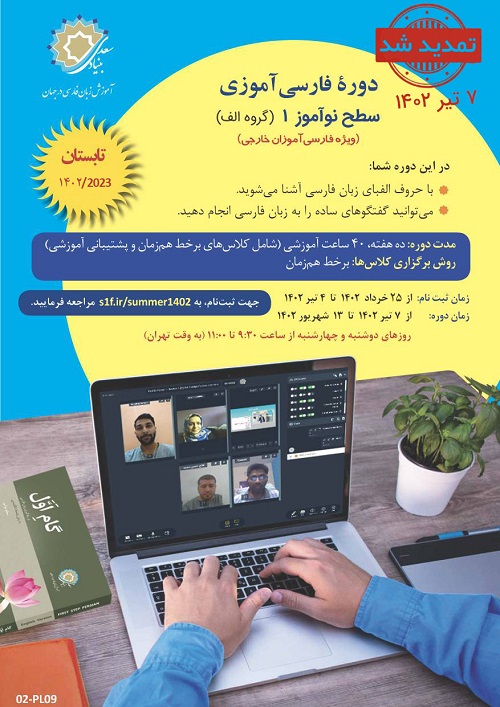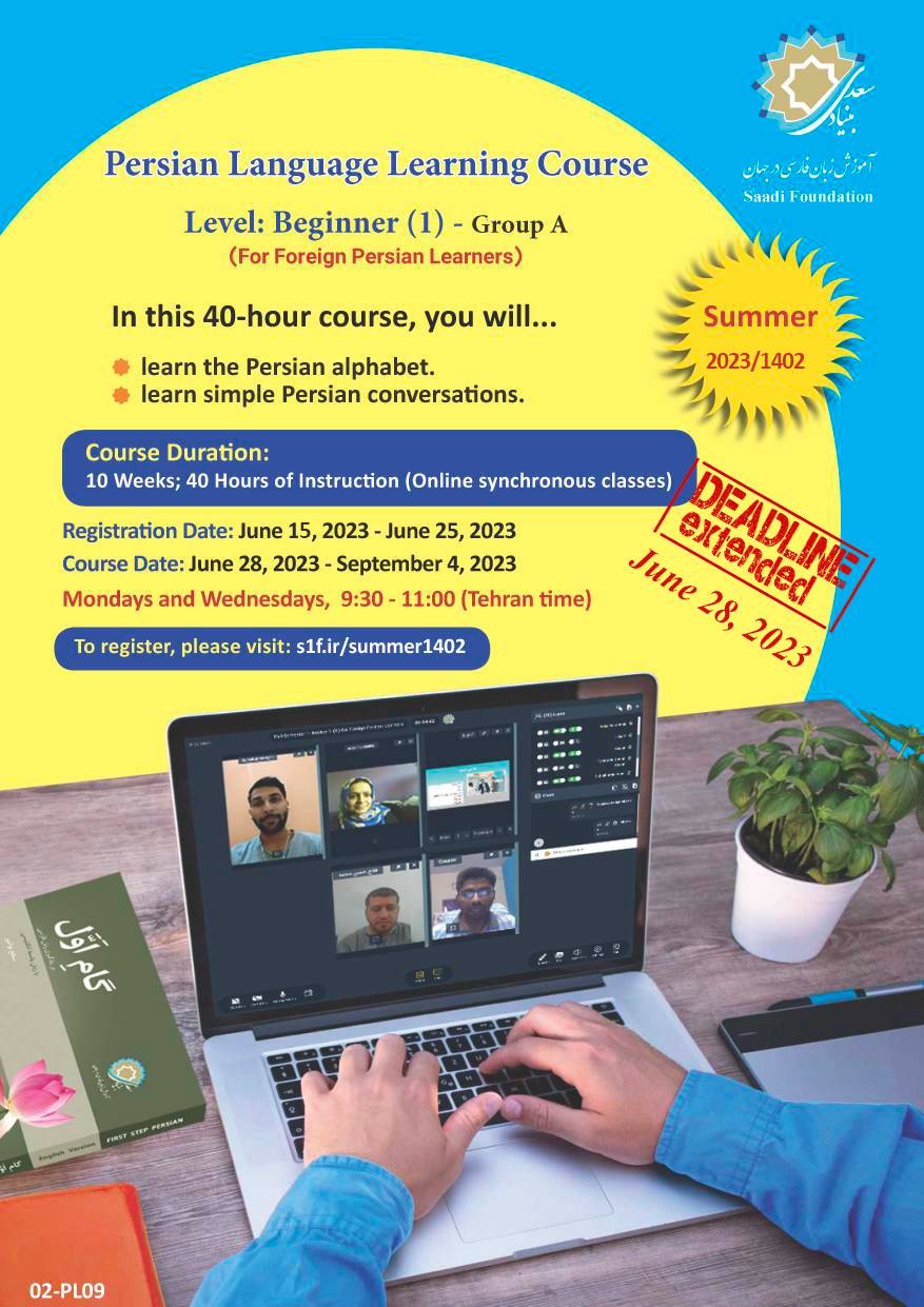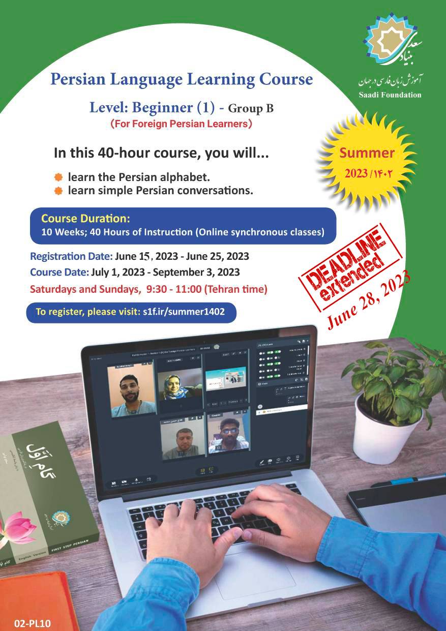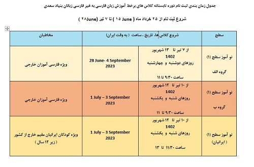 بنیاد سعدی دوره آموزش زبان فارسی در «سطح ۱» را برای فارسی آموزان خارجی و فرزندان ایرانیان مقیم خارج از کشور در فصل تابستان ۱۴۰۲ به صورت برخط همزمان (مجازی) برگزار میکند و ثبت این دورهها از ۲۵ خرداد ( June ۱۵) آغاز و تا ۷ تیر ( June ۲۸) ادامه دارد.