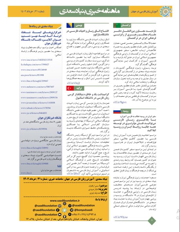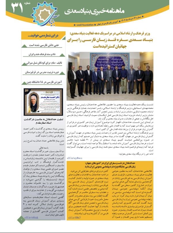 سی و یکمین «ماهنامه خبری آموزش زبان فارسی به غیر فارسی زبانان» در سه عنوان «اخبار بنیاد سعدی»، «آموزش زبان فارسی در جهان» و «بنیاد سعدی در رسانهها» ویژه خردادماه ۱۴۰۲ منتشر شد.