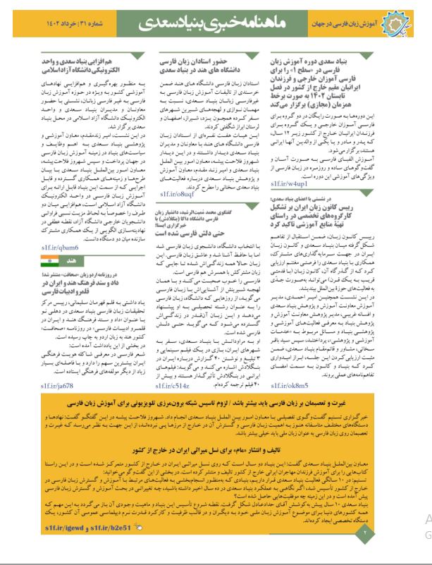به گزارش روابط عمومی بنیاد سعدی، نسخه الکترونیک «ماهنامه خبری آموزش زبان فارسی به غیر فارسی زبانان» این امکان را برای علاقهمندان به رویدادهای زبان فارسی در سراسر جهان فراهم آورده که با کلیک بر روی پیوند کوتاه در پایان هر مطلب، خبر اصلی را به صورت کامل در وبگاه بنیاد سعدی مشاهده کرده و بخوانند.