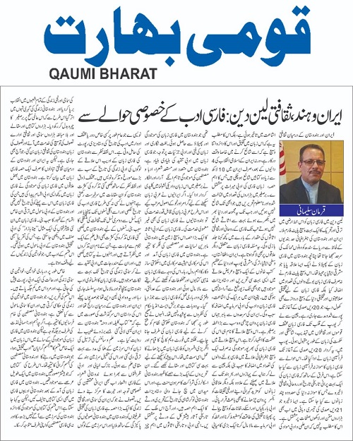 بخش دوم یادداشت «مراوده فرهنگی ایران و هند در قلمرو ادبیات فارسی» به قلم رئیس مرکز تحقیقات زبان فارسی بنیاد سعدی در دهلی نو در روزنامههای اردو زبان «صحافت» و «قومی بهارت» منتشر شده است.