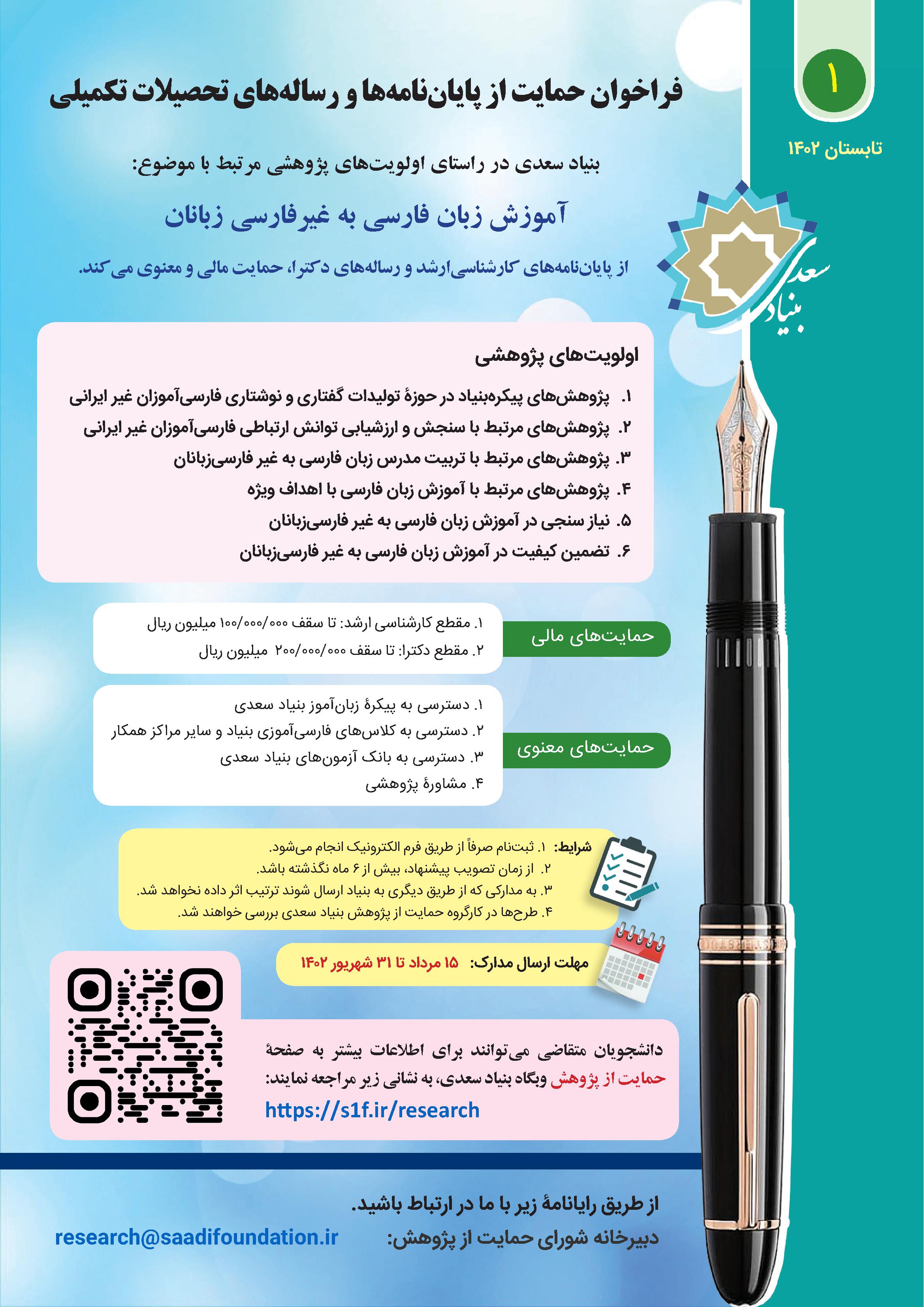 بنیاد سعدی از پایاننامه و رسالههای مرتبط با «آموزش فارسی» حمایت میکند