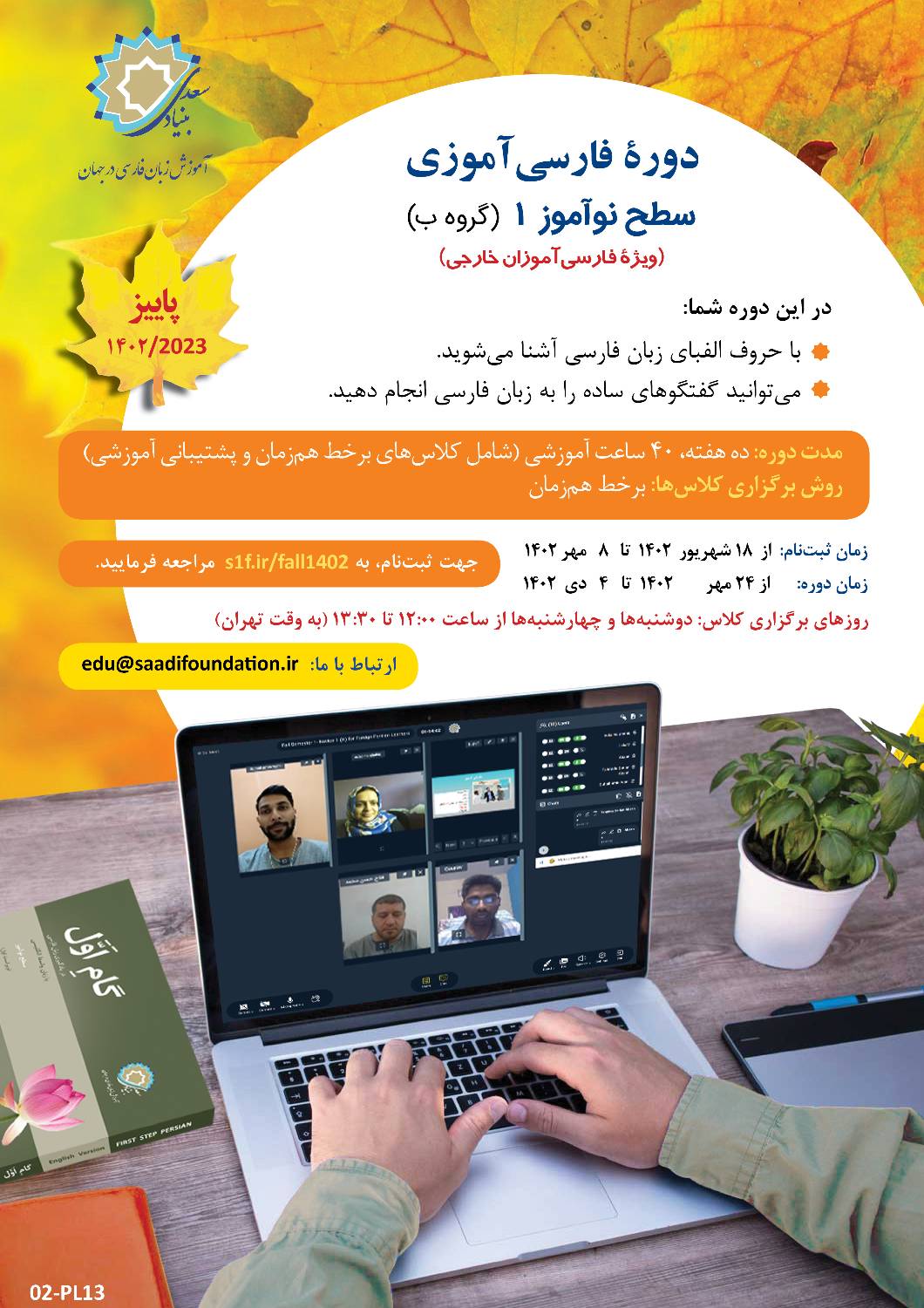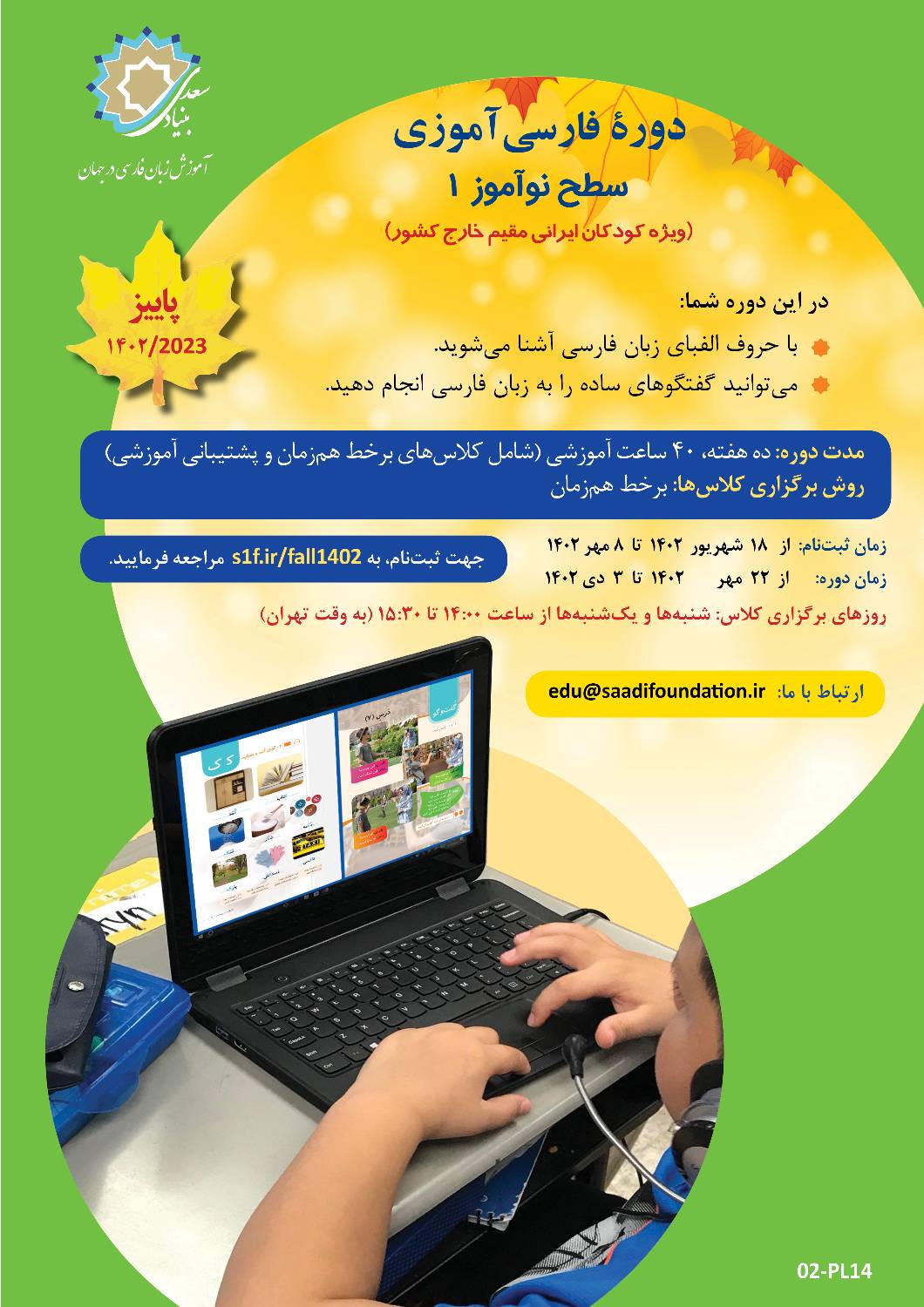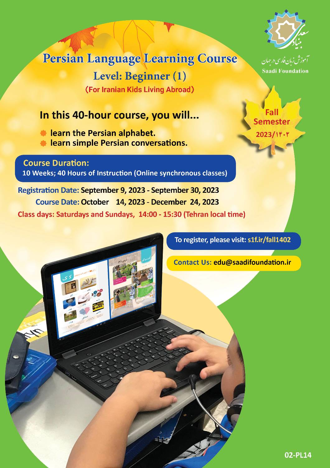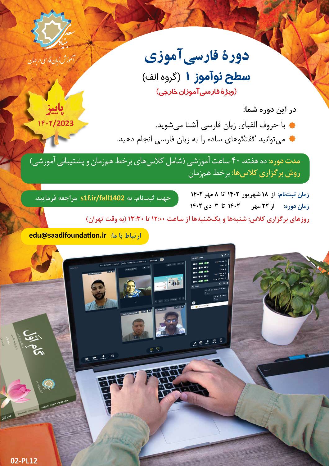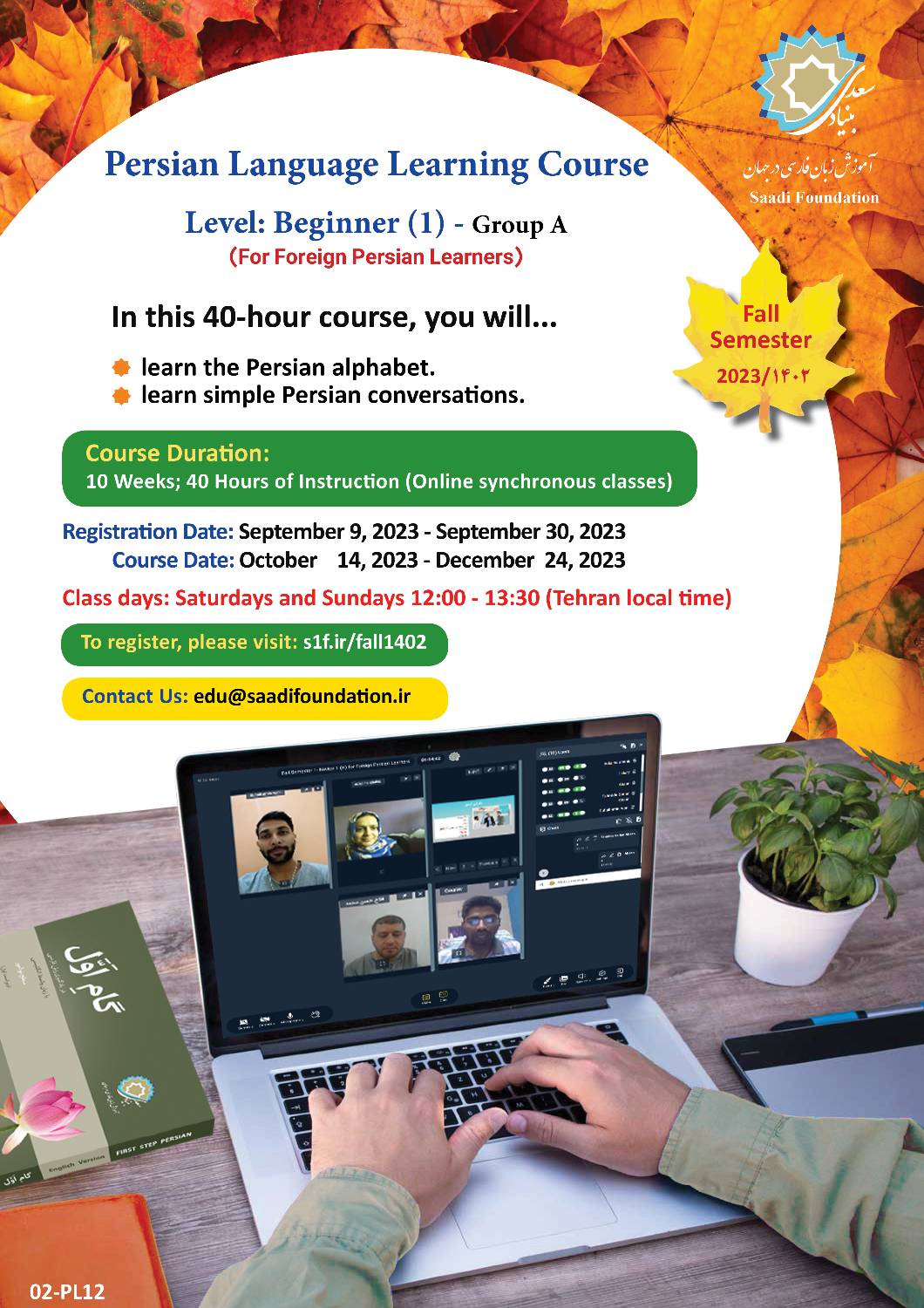 بنیاد سعدی دوره آموزش زبان فارسی فصل پاییز ۱۴۰۲ را در «سطح ۱» برای فارسی آموزان خارجی و فرزندان ایرانیان مقیم خارج از کشور به صورت برخط همزمان (مجازی) برگزار میکند و ثبت این دورهها از ۱۸ شهریور ماه ۱۴۰۲ آغاز و تا ۸ مهرماه ۱۴۰۲ ادامه دارد.
