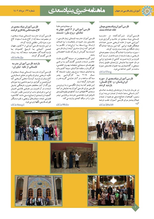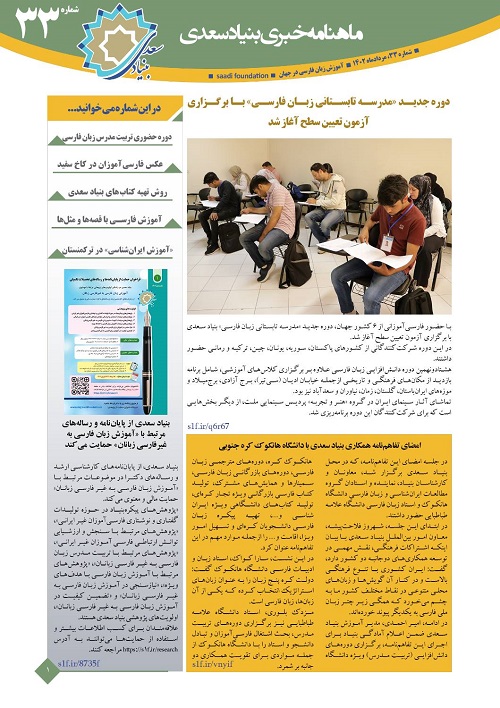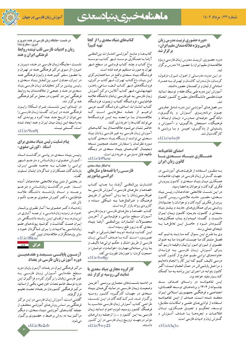 عمده مطالب نخستین بخش ماهنامه با عنوان «اخبار بنیاد سعدی»، به «برگزاری مدرسه تابستانی زبان فارسی در بنیاد سعدی پرداخته است که این دوره با حضور ۱۳ فارسیآموز از هفت کشور جهان برگزار شد و در طول دوره علاوه بر کلاسهای آموزشی، برنامههای مختلف تفریحی از جمله بازدید فارسیآموزان از کاخ گلستان، موزه سعدآباد، برج میلاد، باغ کتاب و سفر به شهرهای قم و کاشان انجام شد.