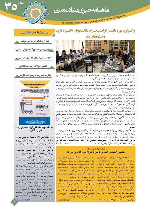 نخستین بخش سی و پنجمین ماهنامه بنیاد سعدی با عنوان «اخبار بنیاد سعدی»، به برگزاری دوره دانشافزایی دانشجویان هندی مقطع دکتری زبان فارسی که میهمان بنیاد سعدی شده بودند و گزارشی از سیر و سیاحت این گروه در کشورمان ازجمله سفر به اصفهان و بازدید از نقاط مختلف شهر تهران پرداخته است. مصاحبه اختصاصی با این فارسیآموزان در رابطه با تجربه سفر به ایران دیگر موضوع مورد اشاره در این بخش است.