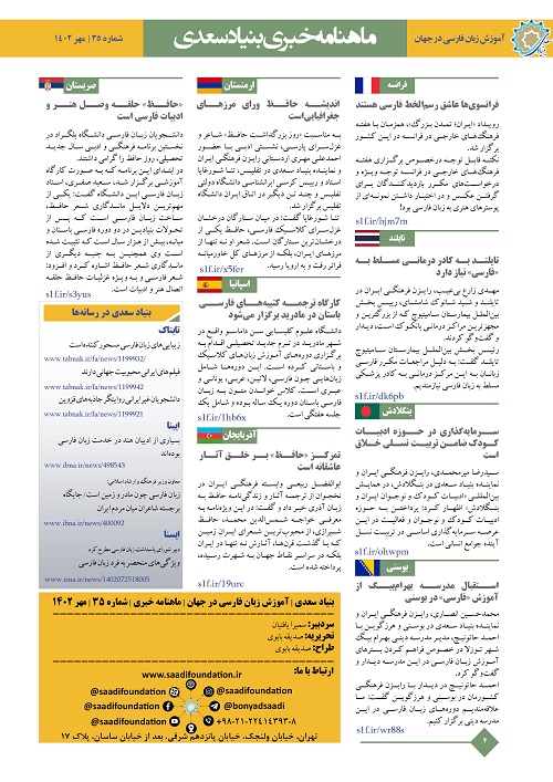برای مطالعه نسخه الکترونیکی «ماهنامه خبری بنیاد سعدی» اینجا کلیک کنید.