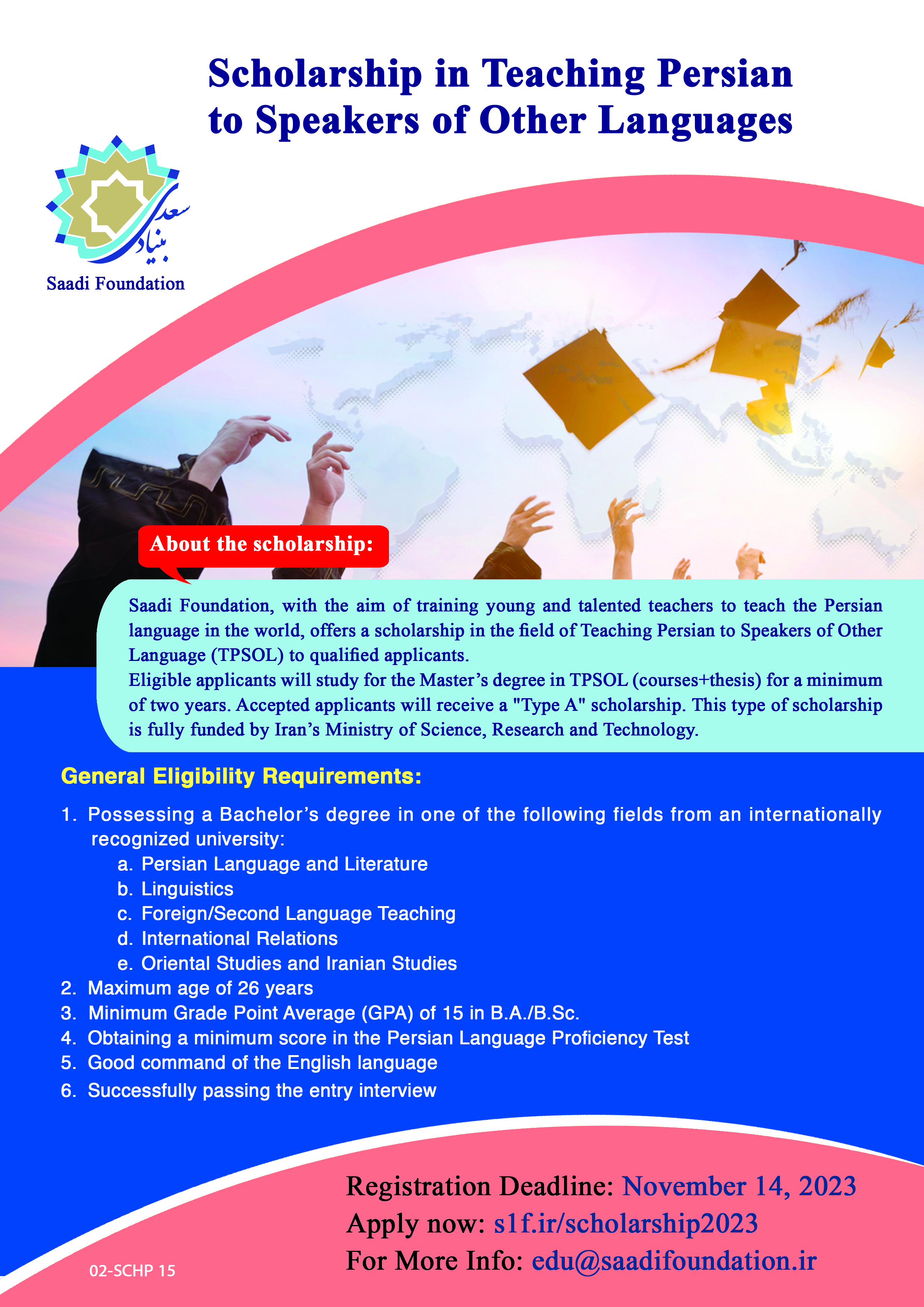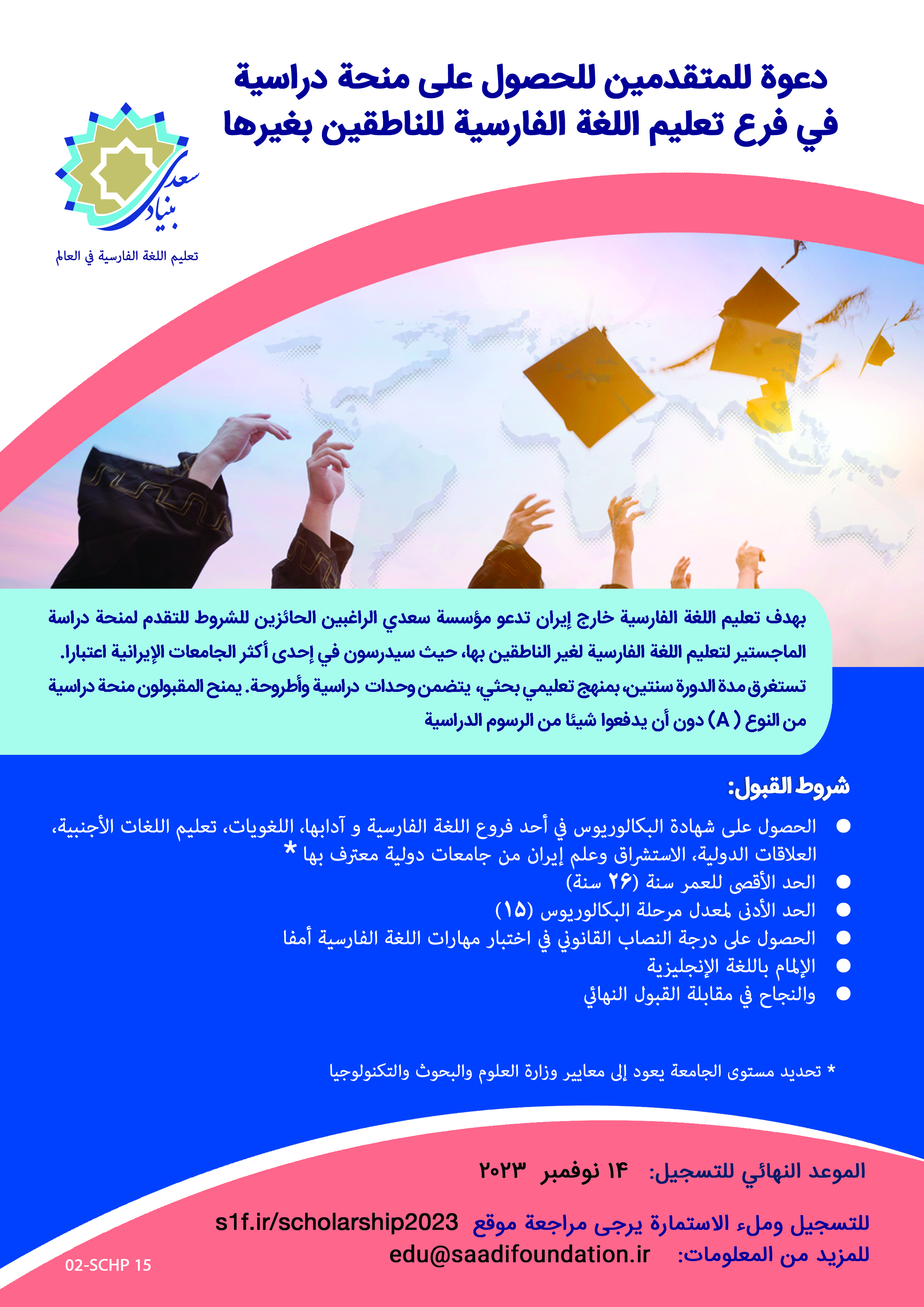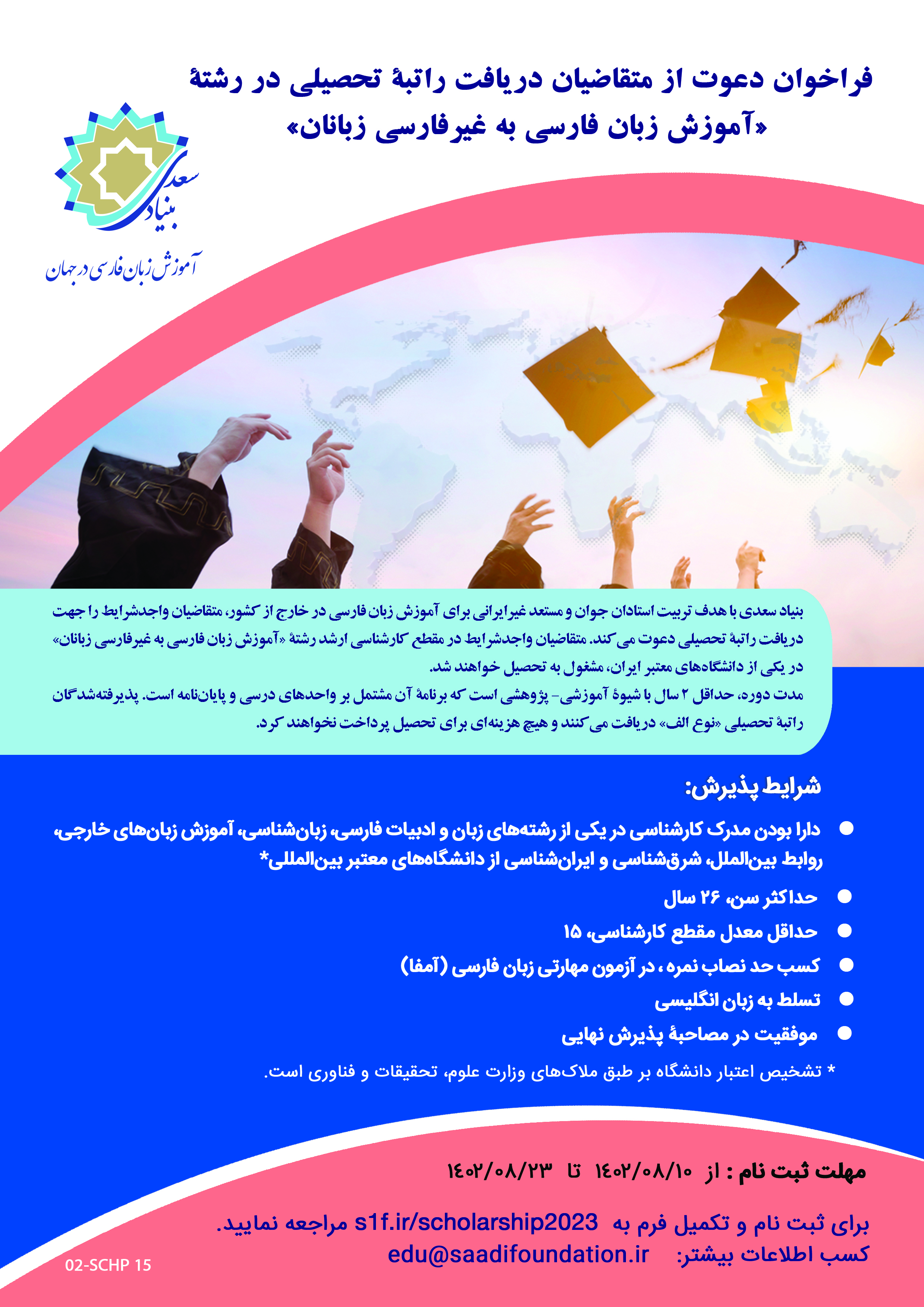 واجدین شرایط برای ثبت نام و تکمیل فرم میتوانند به آدرس s1f.ir/scholarship2023 مراجعه و برای کسب اطلاعات بیشتر به edu@saadifoundation.ir پیام ارسال کنند.