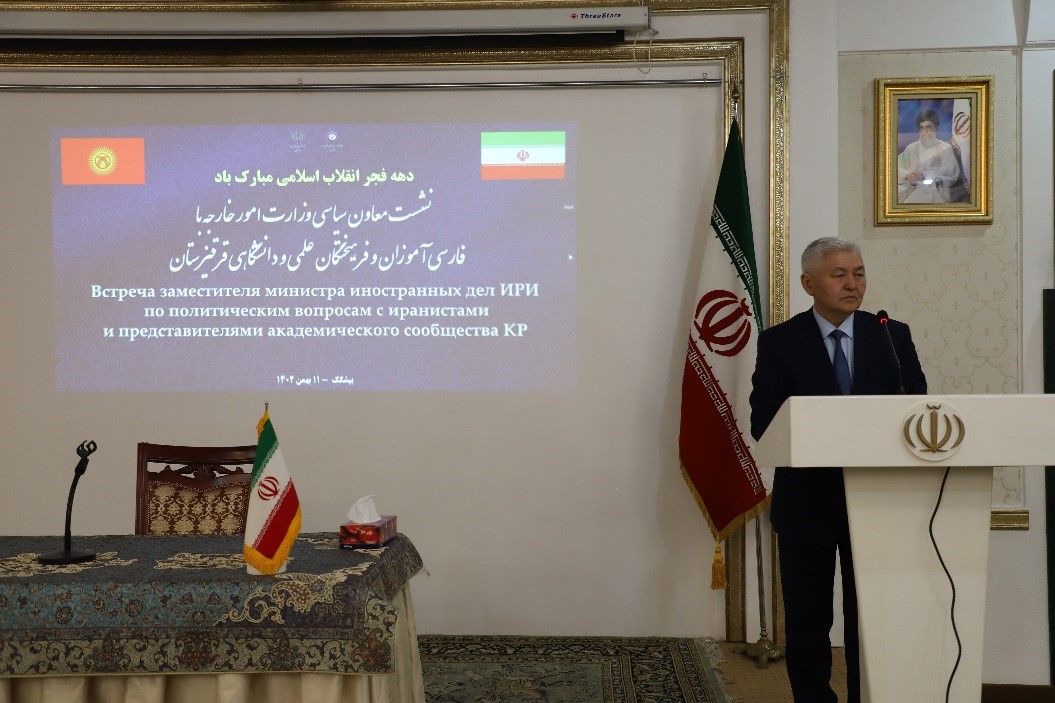 در ادامه، مشرباف رییس دانشکده شرقشناسی دانشگاه دولتی بیشکک ضمن تشکر از برگزاری این مراسم، به معرفی پیشنیه موضوع آموزش زبان فارسی در قرقیزستان پرداخت و گفت: آموزش زبان فارسی از سال 1991 با تشکیل گروه زبان فارسی در دانشگاه ملی قرقیزستان آغاز شد و در همان سال به دلیل برخی تغییرات این گروه به دانشگاه دولتی بیشکک که آن روز با عنوان دانشگاه علوم انسانی فعالیت میکرد، منتقل شد و هسته اولیه آموزش زبان فارسی در قرقیزستان ایجاد شد.