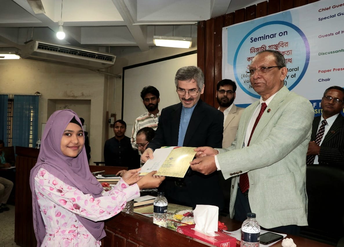 همچنین از طرف رایزنی فرهنگی به 9 نفر از دانش آموختگان ممتاز و رتبه های اول تا سوم مقاطع کارشناسی و کارشناسی ارشد رشته زبان و ادبیات فارسی و نیز دوره آموزش آزاد سطح متوسطه زبان فارسی دانشگاه، جوایز نقدی، تقدیرنامه و بسته چند جلدی کتاب از منشورات رایزنی فرهنگی اهداء شده و به هرکدام از 10 عضو هیئت علمی گروه زبان و ادبیات فارسی این دانشگاه نیز، تابلو خطی حاوی بیت نخستین منظومه مخزن الاسرار نظامی گنجوی که اثر هنرمند خطاط اعزامی به داکا برای برگزاری برنامه هفته قرآنی بود و به سفارش رایزنی فرهنگی در ایام حضور وی در بنگلادش به تحریر در آورده بود، اهدا شد.