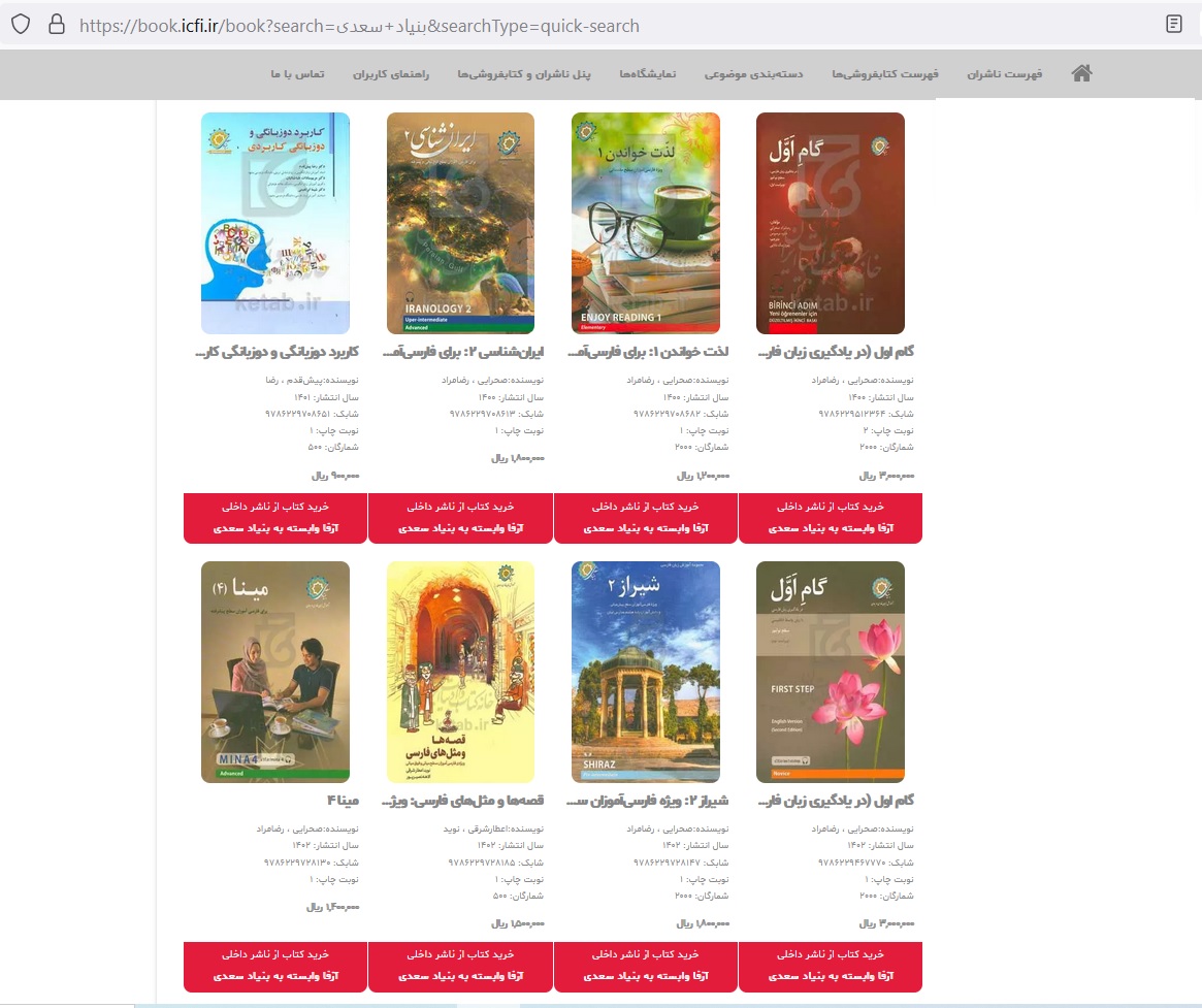 علاقهمندان برای سهولت و دسترسی سریع بر روی پیوند قرمز رنگ زیر کلیک کنند تا مستقیم به وبگاه فروش کتابهای بنیاد سعدی وارد شوند.