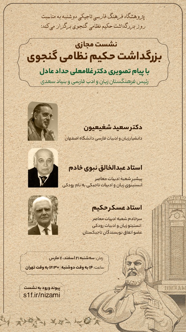در این نشست که روز سه شنبه ۲۱ اسفندماه ( ۱۱ مارس)، ساعت ۱۲:۳۰ به وقت تهران (ساعت ۱۴:۰۰ به وقت شهر دوشنبه) برگزار میشود، سعید شغیعیون؛ دانشیار زبان و ادبیات فارسی دانشگاه اصفهان، عبدالخالق نبوی؛ خادم پیشبر شعبه ادبیات معاصر انستیتوی زبان و ادبیات تاجیکی و عسکر حکیم؛ سرخادم شعبه ادبیات معاصر انستیتو زبان و ادبیات رودکی و عضو اتفاق نویسندگان تاجیکستان سخنرانی می کنند.