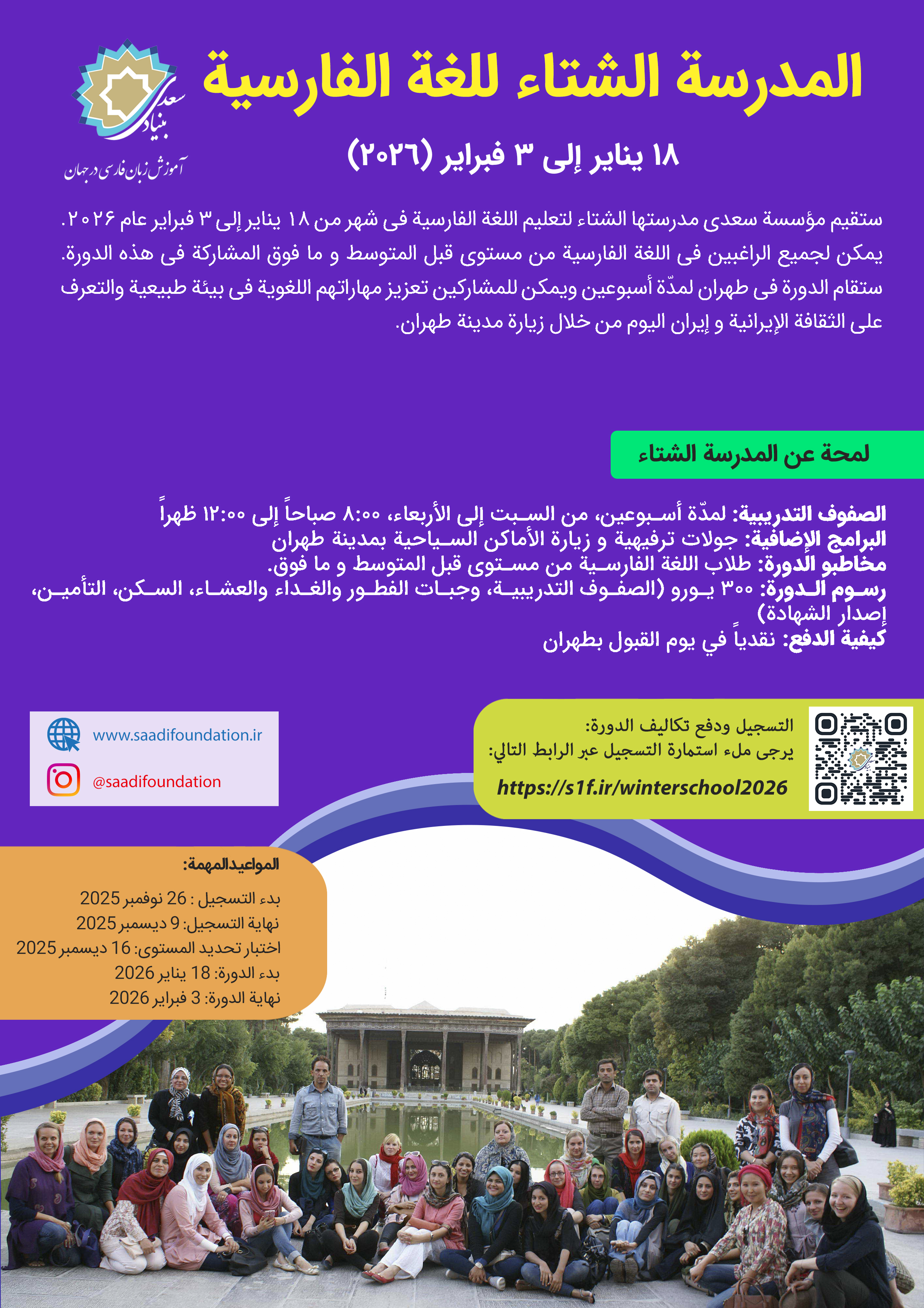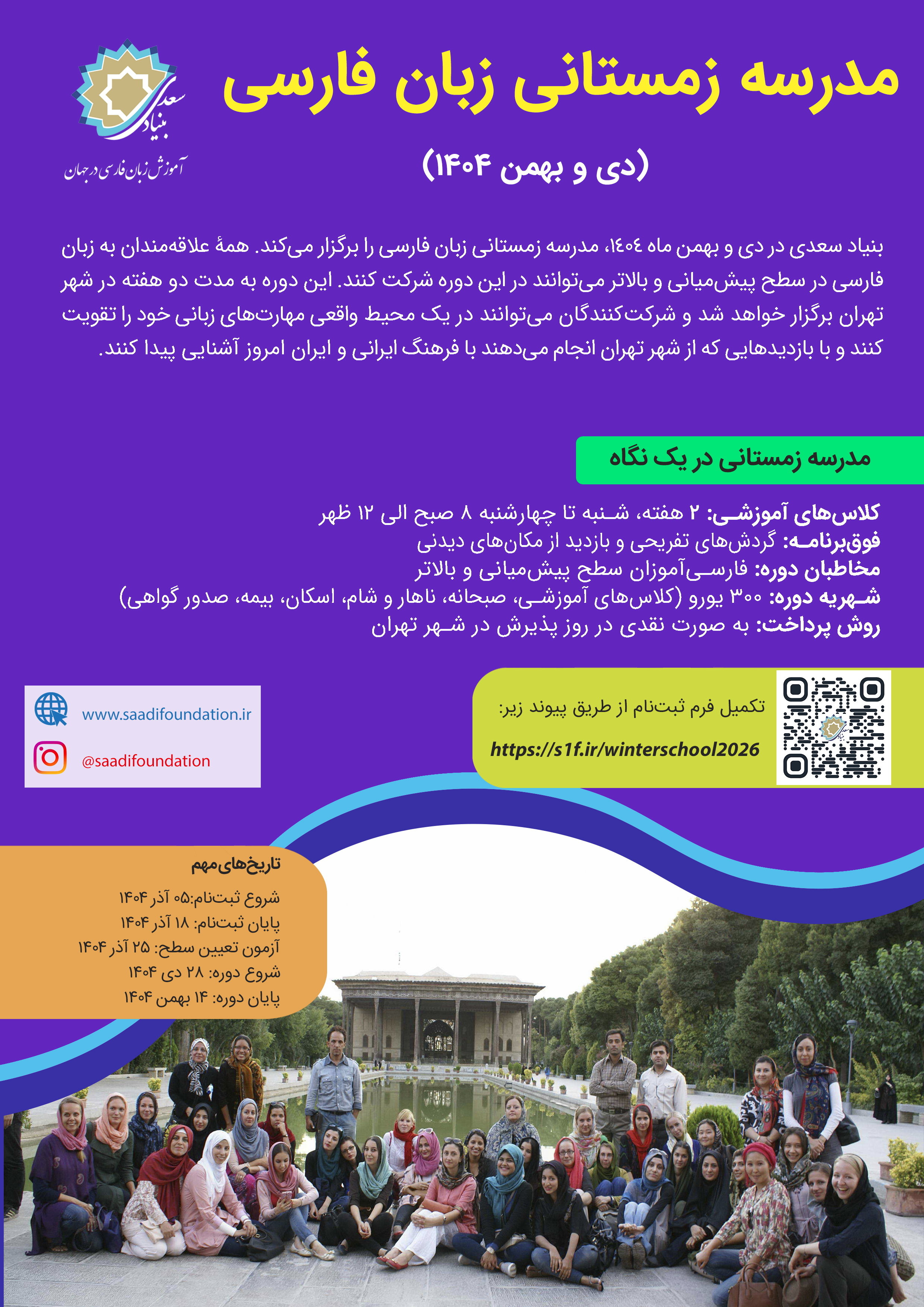 در این دوره، دو هفته آموزش در قالب ۵۰ ساعت کلاس برنامهریزی شده است. بازدید از مکانهای دیدنی و تاریخی شهر تهران نیز از دیگر فعالیتهای مدرسه زمستانی بنیاد سعدی است. علاقهمندان برای ثبتنام به آدرس https://s1f.ir/winterschool2026 مراجعه کنند.