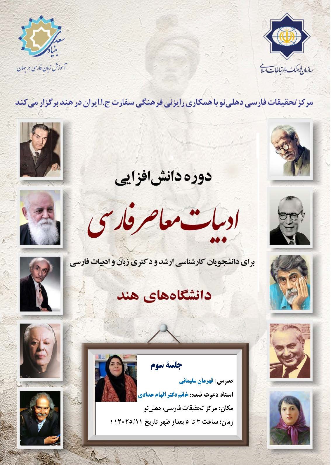 سومین درس‌گفتار از نخستین دوره دانش‌افزایی ادبیات معاصر فارسی برای دانشجویان کارشناسی ارشد و دکتری زبان و ادبیات فارسی دانشگاه‌های هند، با همکاری رایزنی فرهنگی جمهوری اسلامی ایران در این کشور و مرکز تحقیقات فارسی و نمایندگی بنیاد سعدی در دهلی‌نو برگزار شد.