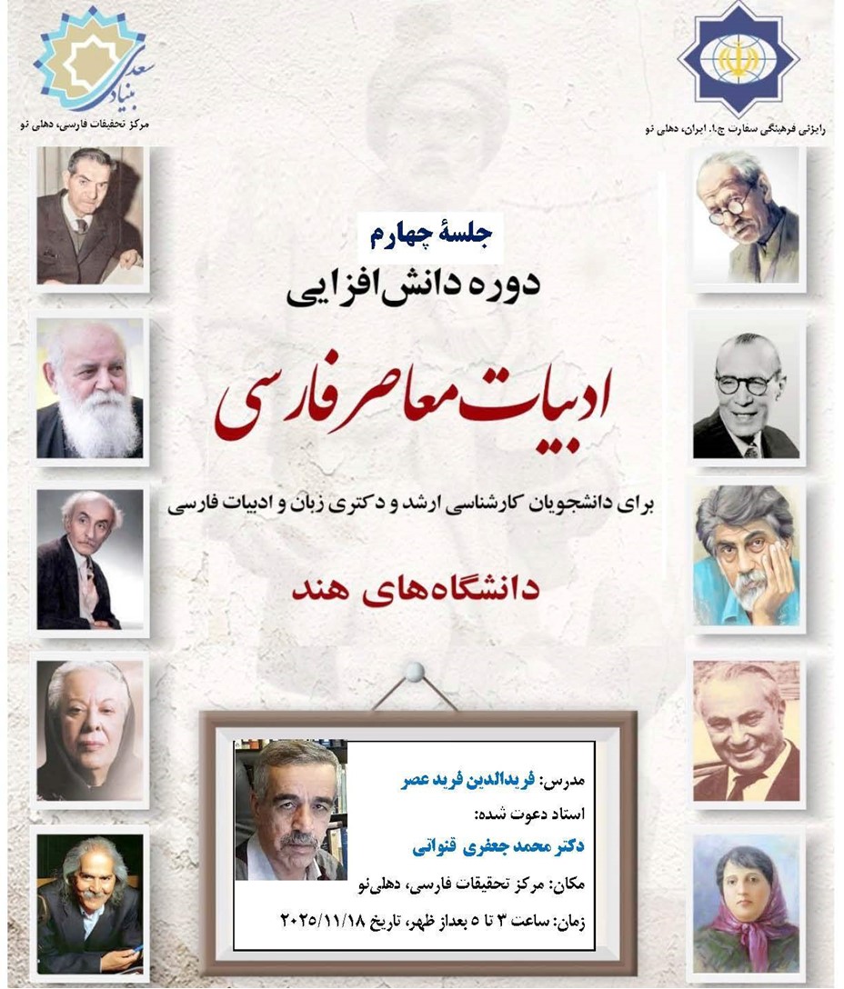 نخستین دوره دانشافزایی ادبیات معاصر فارسی با هدف تقویت مهارتهای زبانی و ادبی دانشجویان هندی، هر هفته روزهای سهشنبه در مرکز تحقیقات فارسی و نمایندگی بنیاد سعدی در دهلینو برگزار میشود و در آن چهارده استاد ایرانی و یک استاد هندی به ارائه درسگفتارهای تخصصی میپردازند.