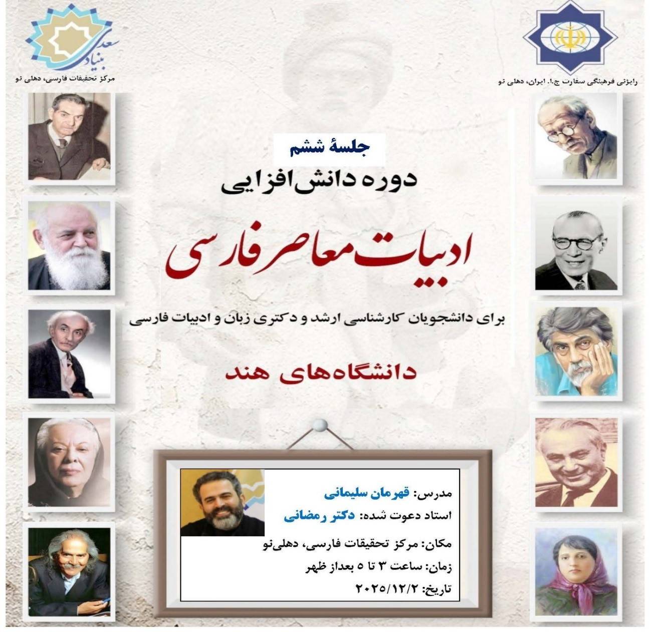 نخستین دوره دانشافزایی ادبیات معاصر فارسی با هدف تقویت مهارتهای زبانی و ادبی دانشجویان هندی، هر هفته روزهای سهشنبه در مرکز تحقیقات فارسی و نمایندگی بنیاد سعدی در دهلینو برگزار میشود و در آن چهارده استاد ایرانی و یک استاد هندی به ارائه درسگفتارهای تخصصی میپردازند.