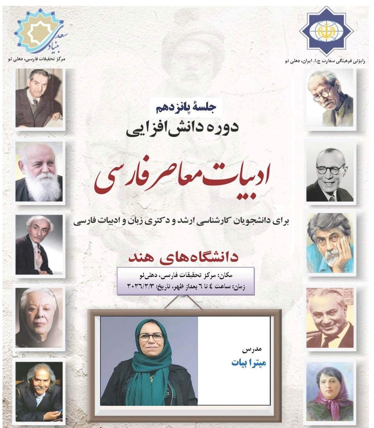 نخستین دوره دانشافزایی «ادبیات معاصر فارسی» با هدف تقویت مهارتهای زبانی و ادبی دانشجویان هندی، هر هفته روزهای سهشنبه در مرکز تحقیقات فارسی و نمایندگی بنیاد سعدی در دهلینو برگزار میشود و در آن ۱۴ استاد ایرانی و یک استاد هندی به ارائه درسگفتارهای تخصصی میپردازند.