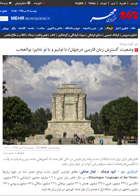 وضعیت گسترش زبان فارسی درجهان در خبرگزاری مهـــــر ۲۸ تیر ۱۳۹۵ | ۱۷:۴۶ کد : ۵۶۳ رویدادهای پیش رو ارسال به دیگران نام شما ایمیل شما ایمیل دریافتکننده ارسال انصراف تعداد بازدید:۷۹۶ خبرگزاری مهـــر وضعیت گسترش زبان فارسی در جهان را با نگاهی به تلاس کشورهای دیگر در ترویج زبان ملی خود، بررسی کرد. خبرگزاری مهر در گزارشی تفصیلی وضعیت گسترش زبان فارسی در جهان را بررسی کرده است.