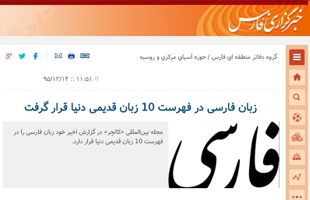 مجله بینالمللی «کالچر» در گزارش اخیر خود زبان فارسی را در فهرست 10 زبان قدیمی دنیا قرار دارد.
