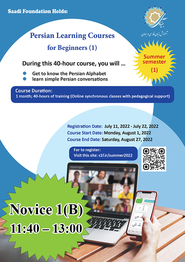 علاقه مندان به آموزش زبان فارسی مقدماتی می توانند با مراجعه به بخش دوره ها به آدرس core.saadifoundation.ir/?lang=en از زمان و تاریخ برگزاری دوره های مجازی آموزش فارسی مطلع شوند.